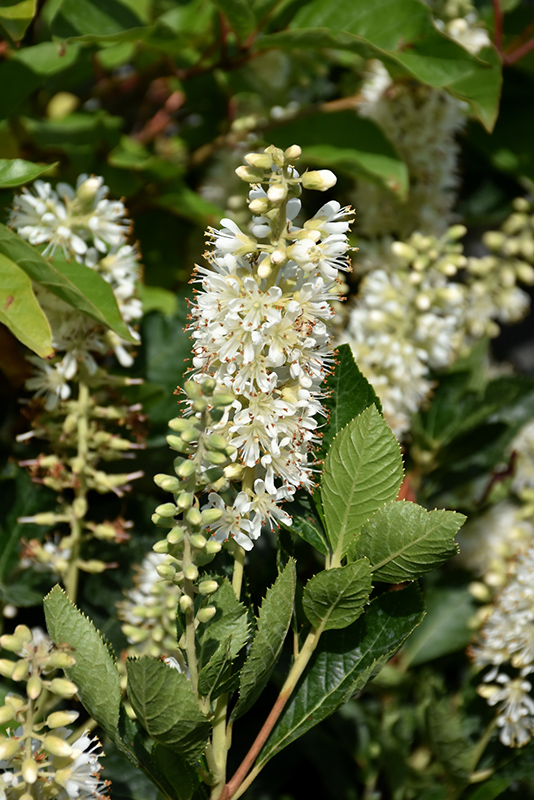 One of the most fragrant of all garden shrubs with showy spikes of sweetly scented white flowers; blooms in late summer when little else is in flower; a very hardy variety, neat, tidy habit of growth and good fall color; needs moist acidic soil
