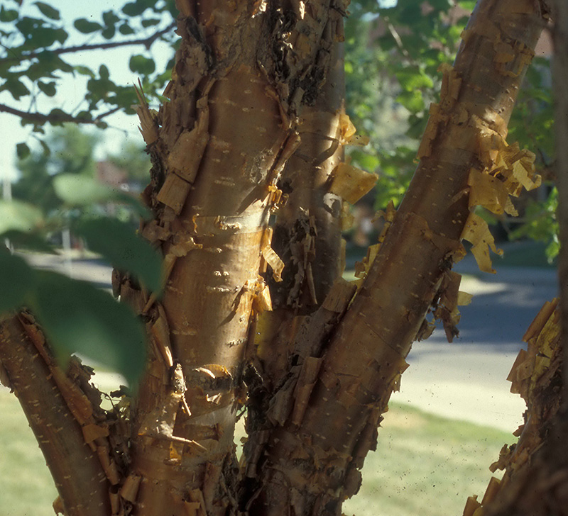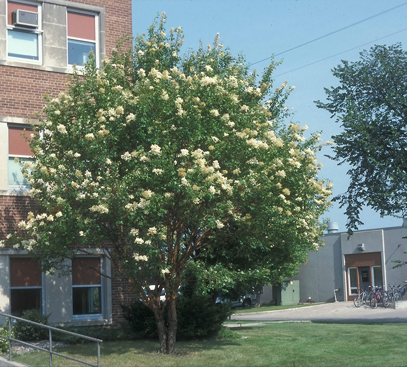 Copper Curls Pekin Lilac features showy plumes of fragrant creamy white flowers rising above the foliage from late spring to early summer. It has dark green deciduous foliage. The pointy leaves do not develop any appreciable fall colour. The peeling coppery-bronze bark is extremely showy and adds significant winter interest.