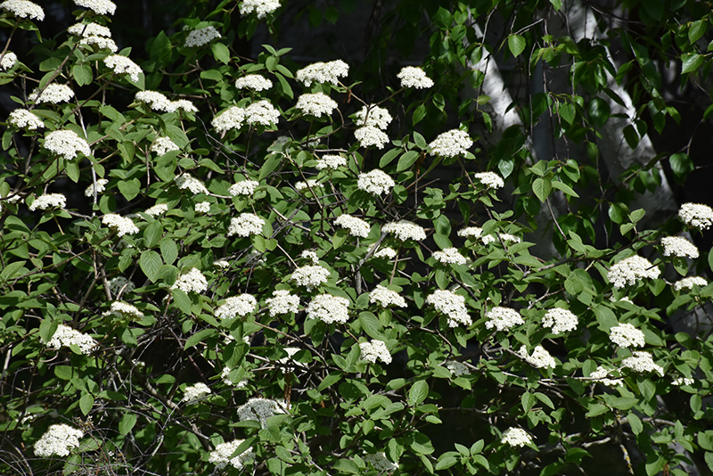 An excellent shrub for landscape use, featuring showy flat-topped clusters of creamy white flowers in spring and fruit which starts pink, changing to red and finally black in fall; very tough and adaptable, somewhat coarse-textured, will grow quite large